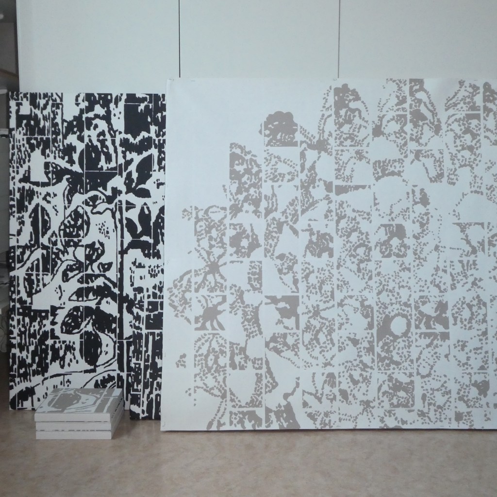 17/50. Spets, akryl på duk, 100×100. Inspirerad av berättelsen om Norrbyskär, sågverksön i Bottenhavet.