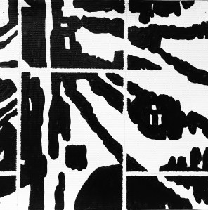 25/50. Potatis /episod, akryl på duk, 20×20. Inspirerad av berättelsen om Norrbyskär, sågverksön i Bottenhavet av Gudrun Norstedt. ”Mellan gatan och brädgården står potatislanden i blom” (sid 20)