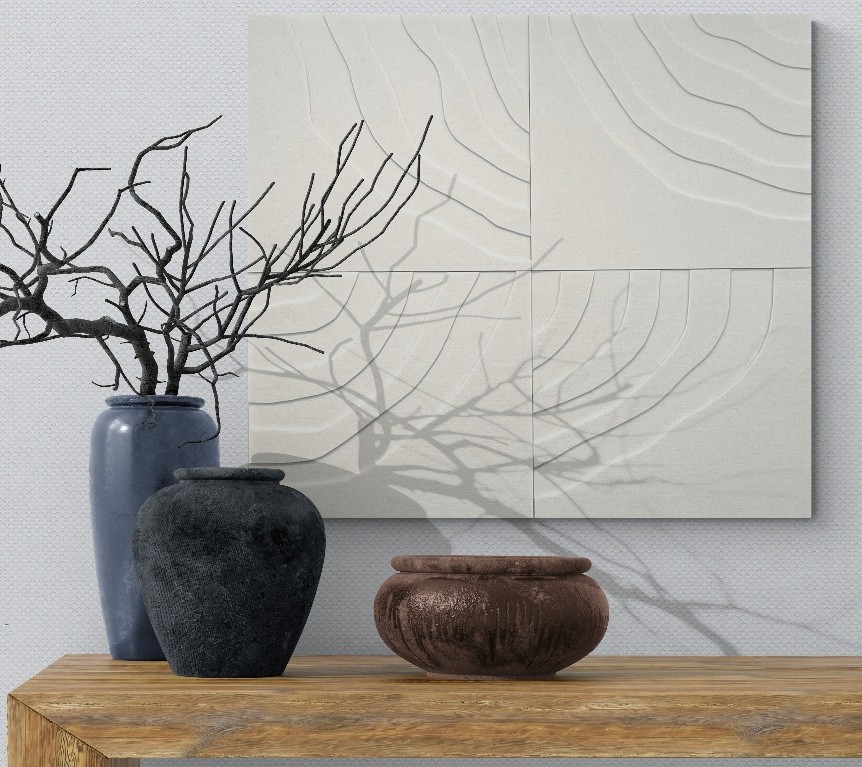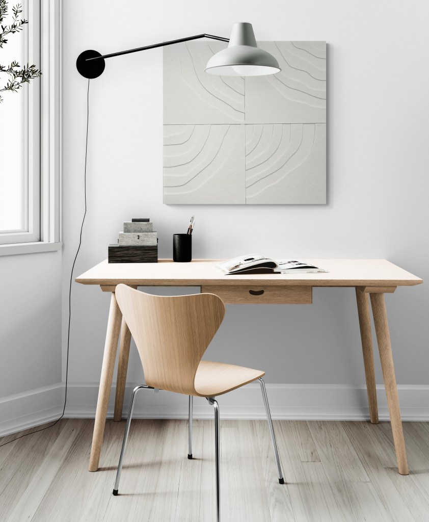 Stilrent handgjort konstverk av ljudabsorberande filt som dämpar ljud och bidrar till en bättre rumsmiljö. Flera konstverk kan monteras på rad, i kvadrat eller i större formationer beroende på rummets estetik och behovet att minska efterklangstiden.