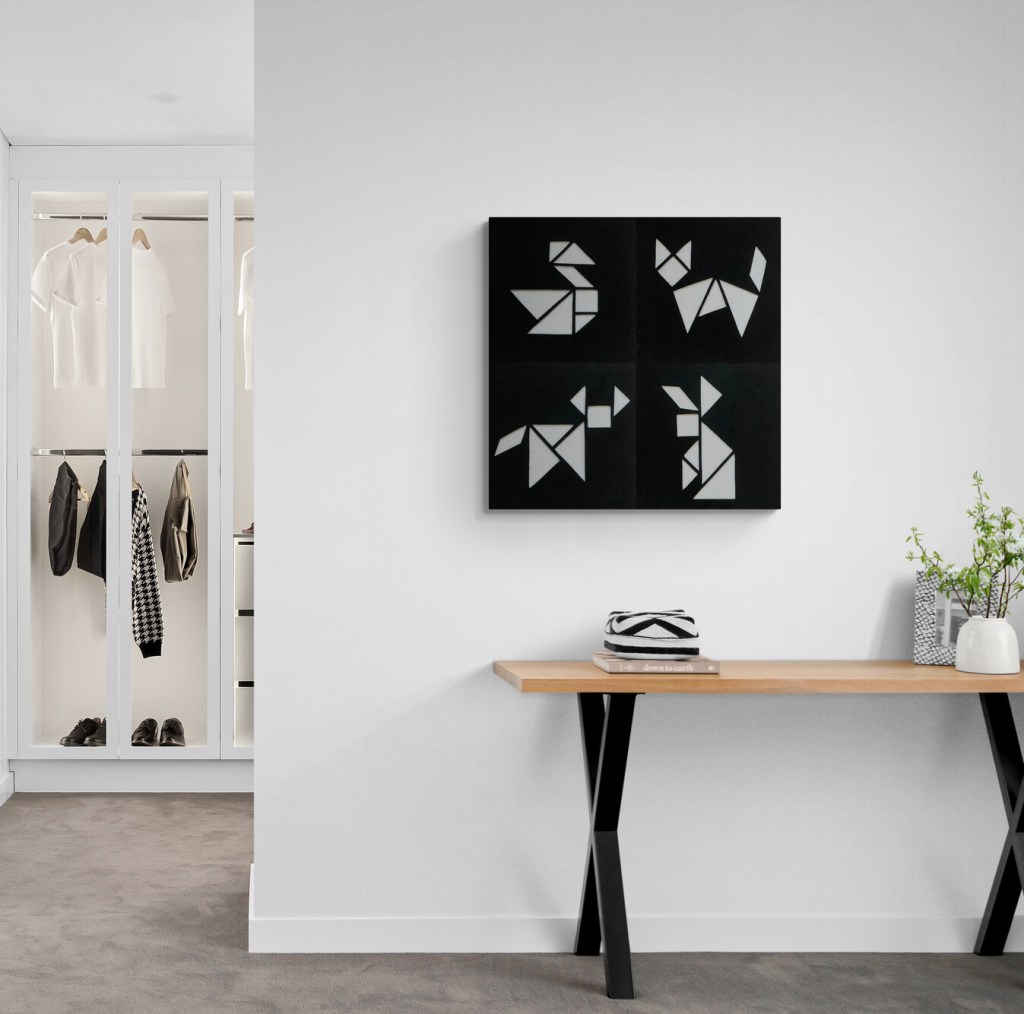 Stilrent handgjort konstverk av filt som dämpar ljud och bidrar till en bättre rumsmiljö. Flera konstverk kan monteras på rad, i kvadrat eller i större formationer beroende på rummets estetik. Konstverket är skapat i återvinningsbar polyester som har många bra egenskaper. Det är giftfritt, lätt, vattentåligt och lättstädat.