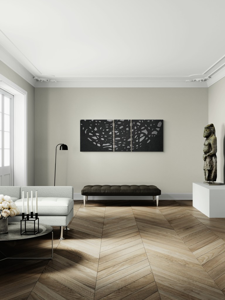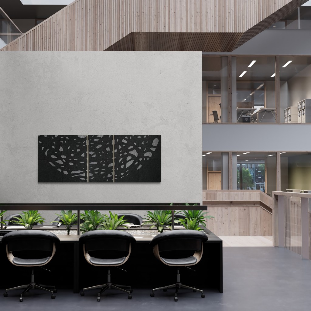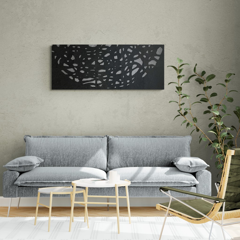 Stilrent handgjort konstverk av filt som dämpar ljud och bidrar till en bättre rumsmiljö. Flera konstverk kan monteras på rad, i kvadrat eller i större formationer beroende på rummets estetik. Konstverket är skapat i återvinningsbar polyester som har många bra egenskaper. Det är giftfritt, lätt, vattentåligt och lättstädat.