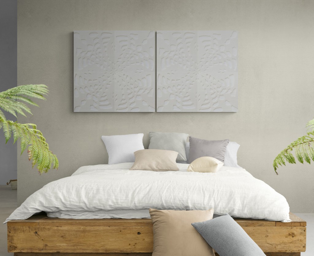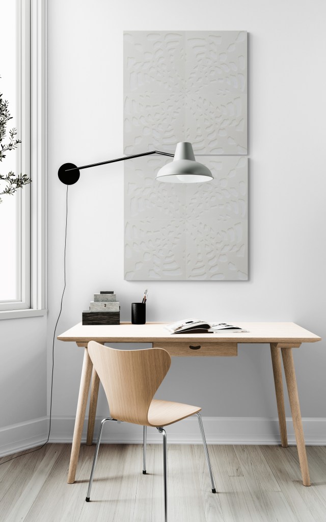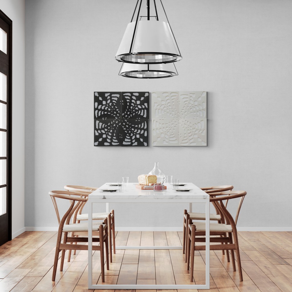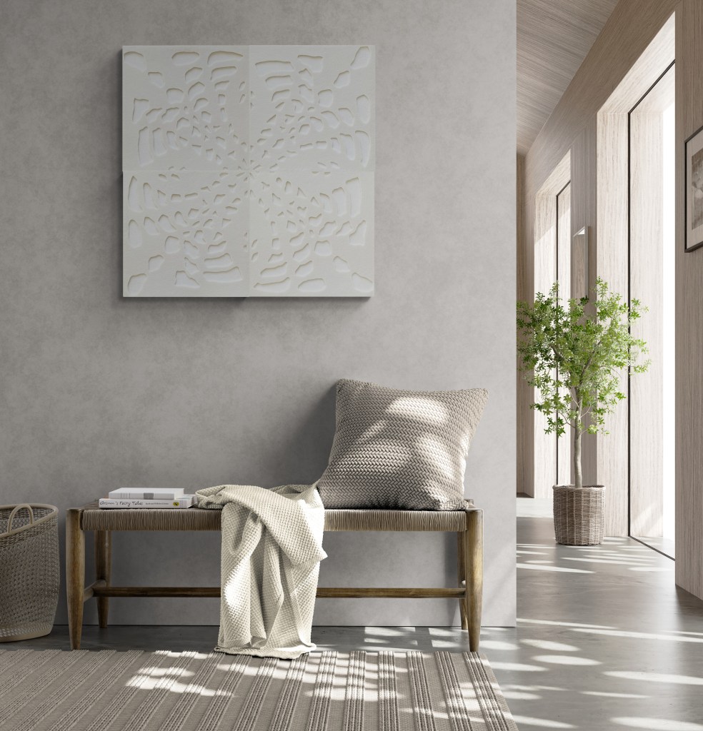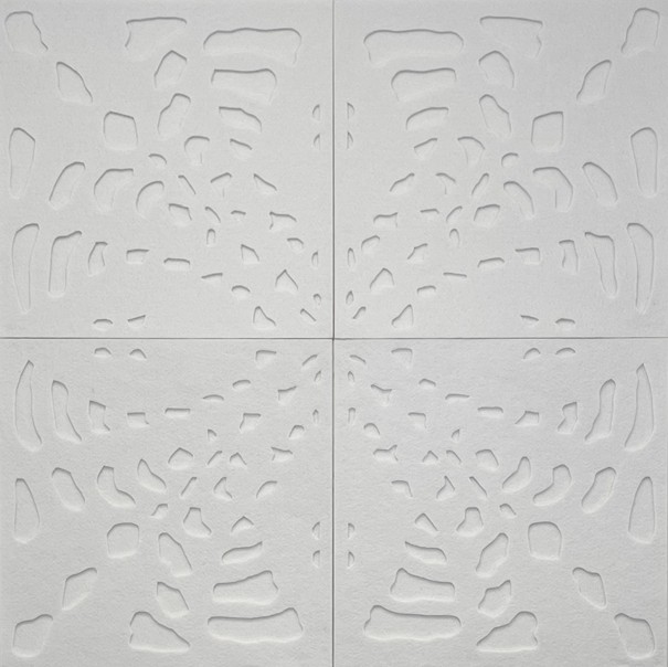 Stilrent handgjort konstverk av filt som dämpar ljud och bidrar till en bättre rumsmiljö. Flera konstverk kan monteras på rad, i kvadrat eller i större formationer beroende på rummets estetik. Konstverket är skapat i återvinningsbar polyester som har många bra egenskaper. Det är giftfritt, lätt, vattentåligt och lättstädat.