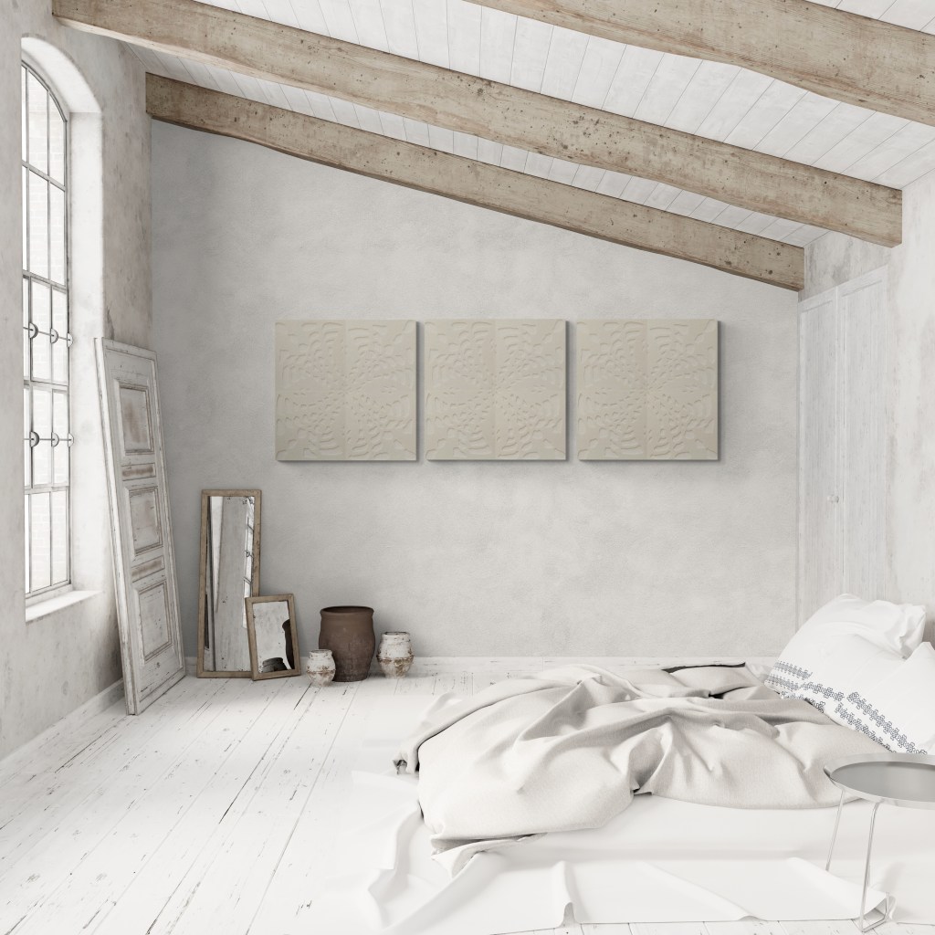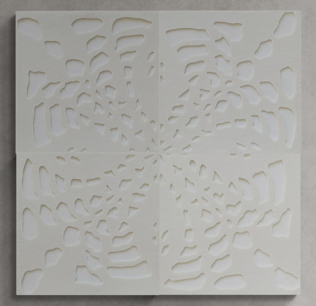 Stilrent handgjort konstverk av ljudabsorberande filt som dämpar ljud och bidrar till en bättre rumsmiljö. Flera konstverk kan monteras på rad, i kvadrat eller i större formationer beroende på rummets estetik och behovet att minska efterklangstiden.