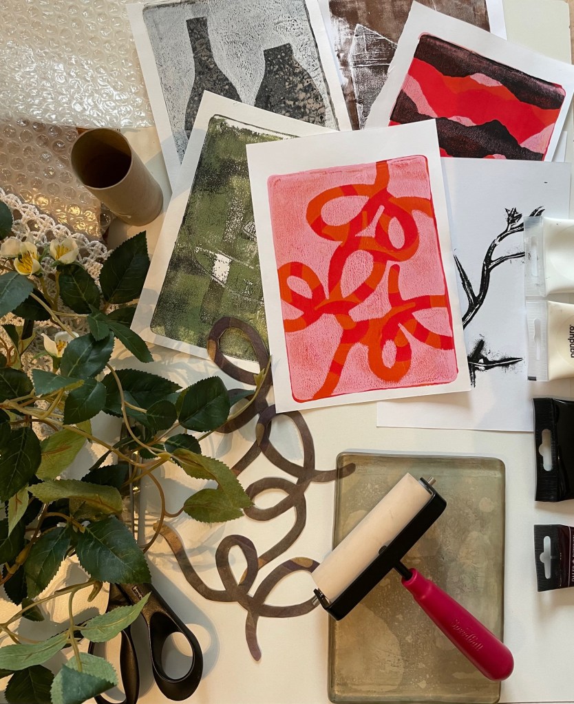 Prova rolig tryckteknik. Workshop i den grafiska metoden ”Gelli Plate Printing”, gelantintryck. Vi använder en gelatinplatta, roller, akrylfärg samt olika material och former för att skapa fantastiska tryck i olika färger och lager. Den klibbiga ytan på plattan gör att det går att skapa mönster, rita på plattan, överföra foton och mycket mer. Det är en enkel tryckteknik som inte kräver några förkunskaper, bara nyfikenhet och ett öppet sinne.